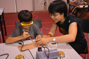 Families and kids programming at the Scientist for a Day. John Lim, in the foreground, shares how everyone can make a robot in less than half an hour by ‘hacking’ a remote control car