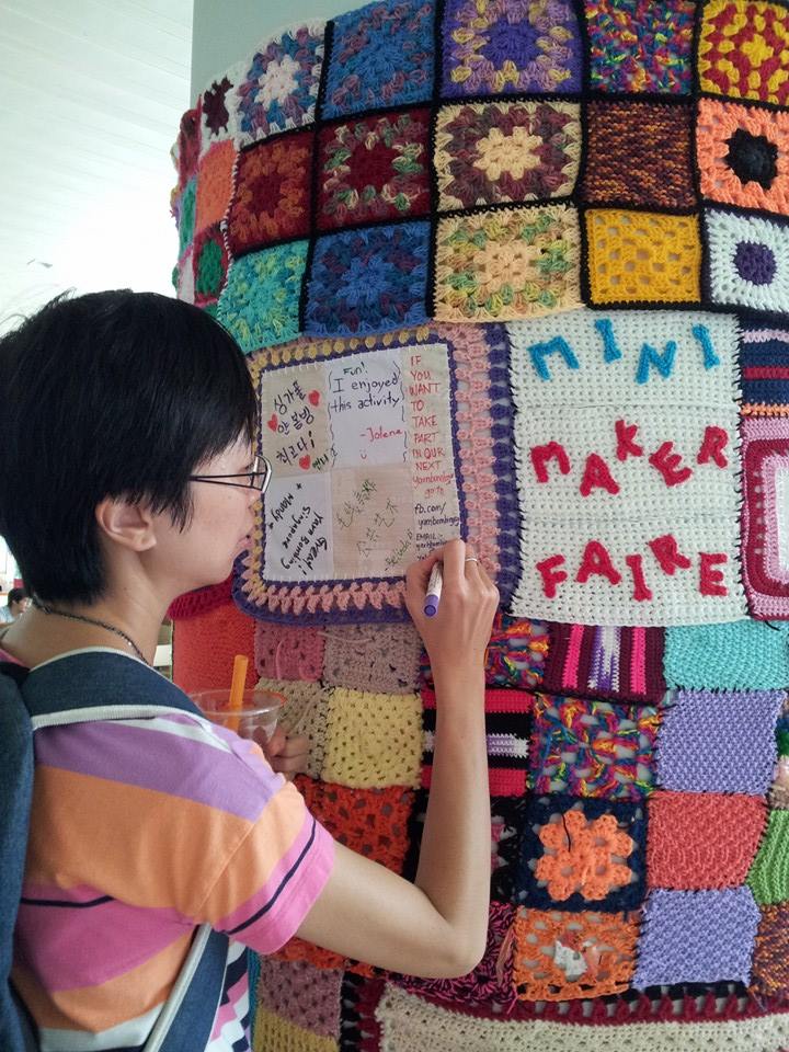Agatha Lee, one of the lead community Makers behind the YangbombSG project signs the yarnbombed pillar at SMMF’14
